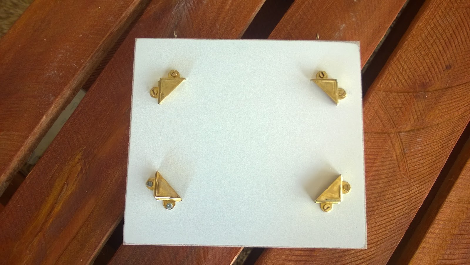 On the board chosen to be the bottom piece, the one with only two eyelets, measure and screw in mirror corners. Again, it might be helpful to first drill small pilot holes.